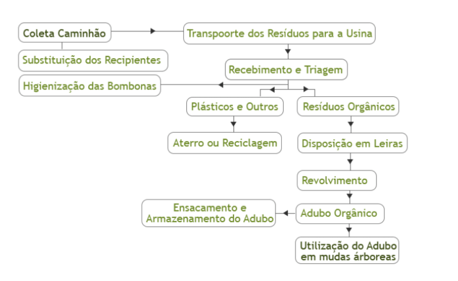Coletamos e transportamos os resíduos orgânicos para a nossa Usina de Compostagem, onde são triados e dispostos em leiras, revolvidos, monitorados, peneirados e ensacados, ou utilizados na produção de mudas já como adubo orgânico, como explicitado no fluxograma a seguir: